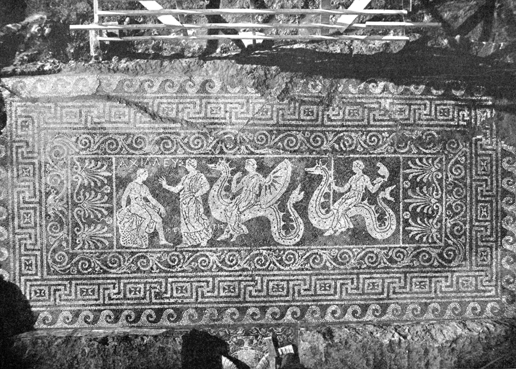 Tetis y las nereidas llevando las armas a Aquiles. Olinto, Casa de la Buena Fortuna.png